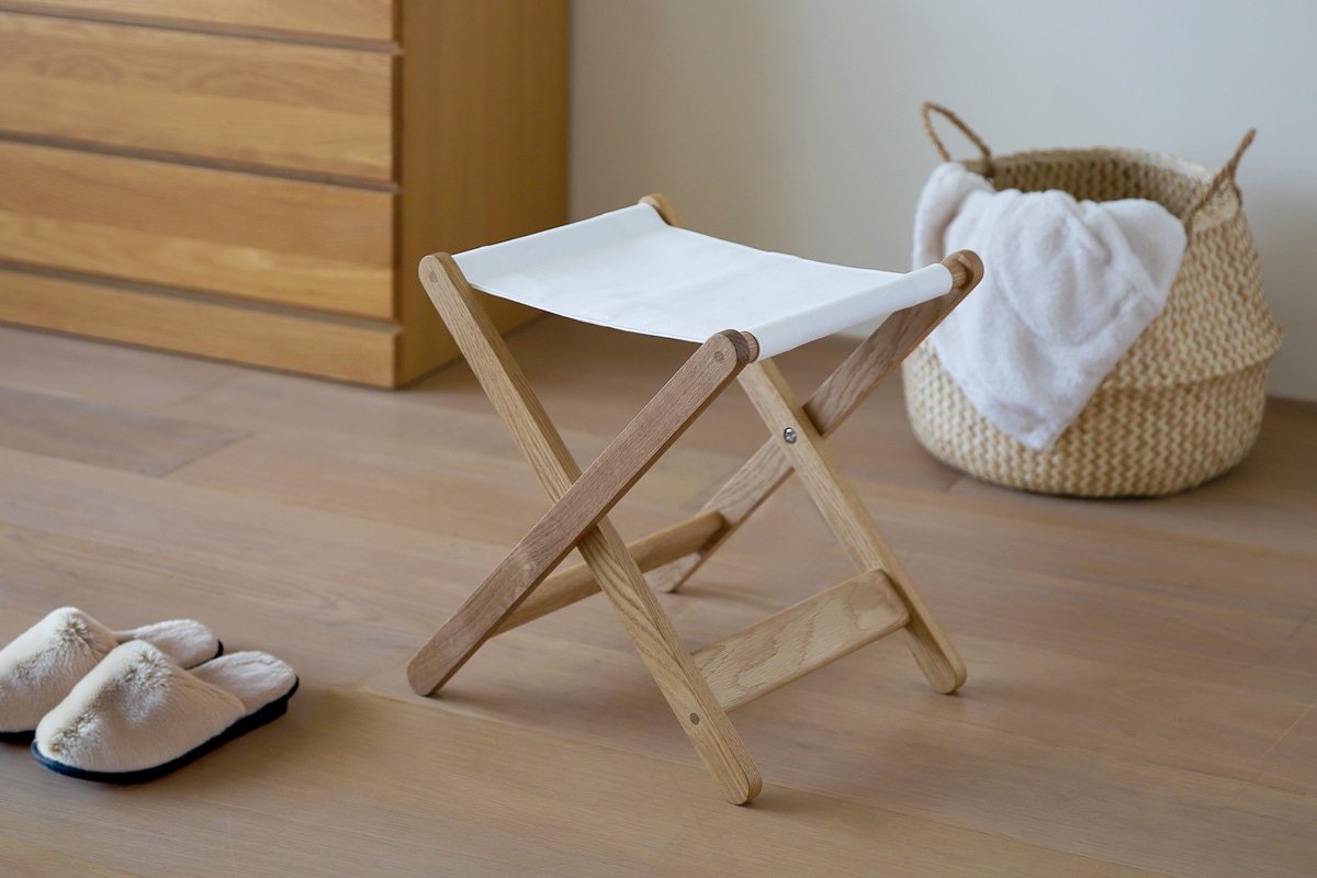 いろんな場所で、暮らしに合わせて活躍してくれる便利な折りたたみスツール。座面には帆布を、フレームは無垢材の素材感をそのまま楽しめるシンプルなつくりで、どのようなインテリアにも自然になじみます。