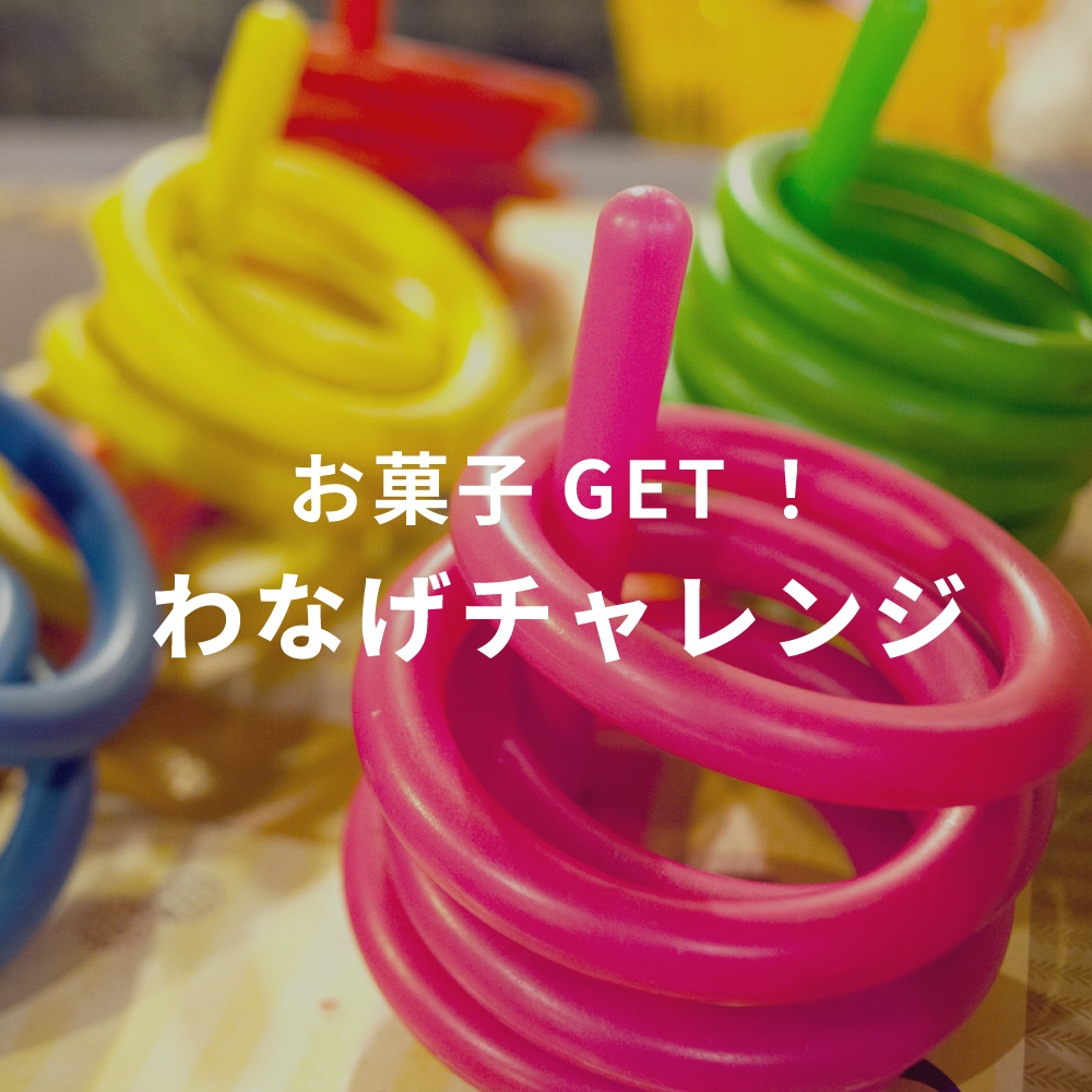 | 開催概要 | 参加費無料でどなたでも参加できる「わなげチャレンジ」。わなげ3本成功するとお菓子の詰め合わせをプレゼント♪もし失敗しても、お菓子1個プレゼントいたします! |